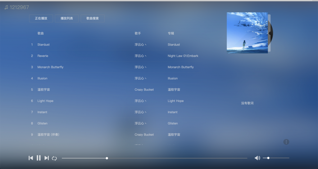 已修复在线音乐播放 2021-2-11 10:08 | 1,682| 0| 公告 50 字| 几秒读完本文最后更新于 1787 天前,其中的信息可能已经有所发展或是发生改变。由于网易云的封杀导致在线播放列表只能显示出三首歌曲目前已经修复 可以正常显示列表地址:https://1212967.xyz/music