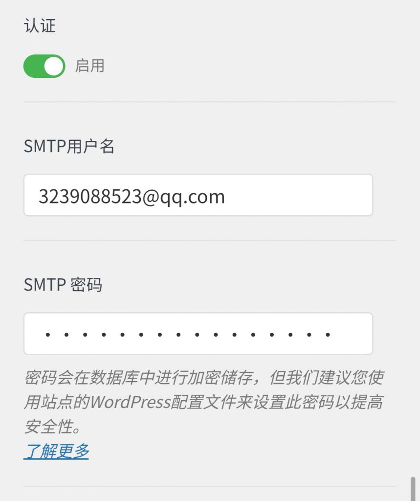 启用认证,账户输入你的邮箱地址,密码输入你刚才获得的授权码
