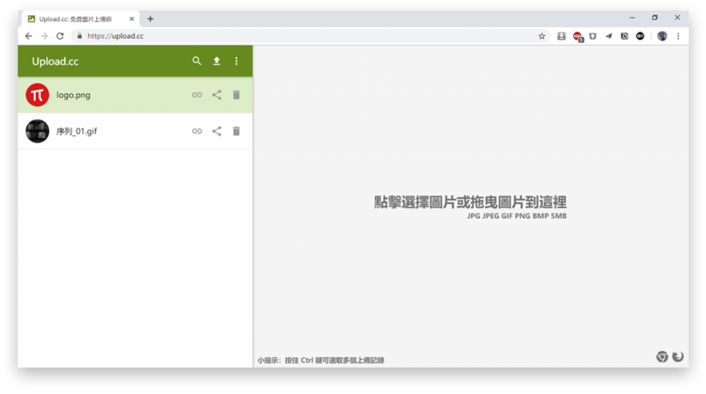upload.cc 提供了浏览器插件。如果你使用的是 Chrome 或 Firefox 浏览器,可以通过插件直接上传图片。插件的下载链接在这里:Chrome、Firefox。在测试中,GIF 上传耗时近 8 秒,PNG 可以秒传。