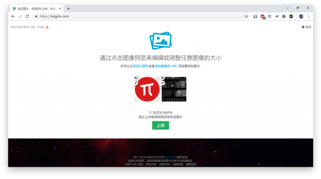 与 SM.MS 一样,路过图床也是适合作为主力图床的工具。它以「无限空间」和「无限流量」作为最大的亮点,同时具有全球 CDN 加速以确保高速、稳定。在上传测试中,GIF 上传耗时约 5 秒。路过图床较为繁琐的一点是,它会先显示预览和编辑,需要进行二次确认。