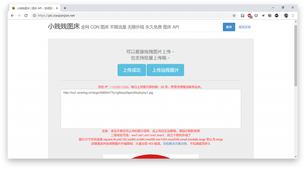 小贱贱图床对上传数量做出了限制。每日仅支持上传 20 张图片,适合上传需求较少的用户。你可以在 这里 使用小贱贱图床。