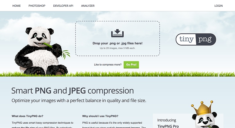 Tinypng可以说是很受大家欢迎的一个图片压缩站点,不管对于前端工程师或者设计师来说都是一个不错的图片压缩工具。Tinypng的操作方式也十分的简单,上传、压缩、下载,流程十分的简单,网站不仅仅支持png格式的图片,jpg、gif格式的图片也是支持的。虽然Tinypng每个月有500张图片的限制,但我想应该完全可以满足你的需求了,如果你的需求更多的话,可以开通Tingpng为你提供的会员专线。不过Tinypng的功能可以说算是无损压缩了,大家可以尝试一下。