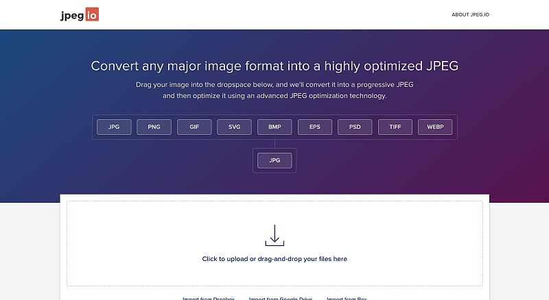 Jpeg是一个十分简单的图片格式转换和图片压缩的站点,不过它最终将不同格式的图片经过算法统一转换成Jpeg的格式,你可以选择任何其它格式的图片进行压缩和转换。图片格式支持JPG, PNG, GIF, SVG, BMP, EPS, PSD, TIFF and WEBP,如果你的图片的最终格式是JPEG的话,我想它应该可以满足你的需求,并且网站是免费的,你可以尽情的享用。